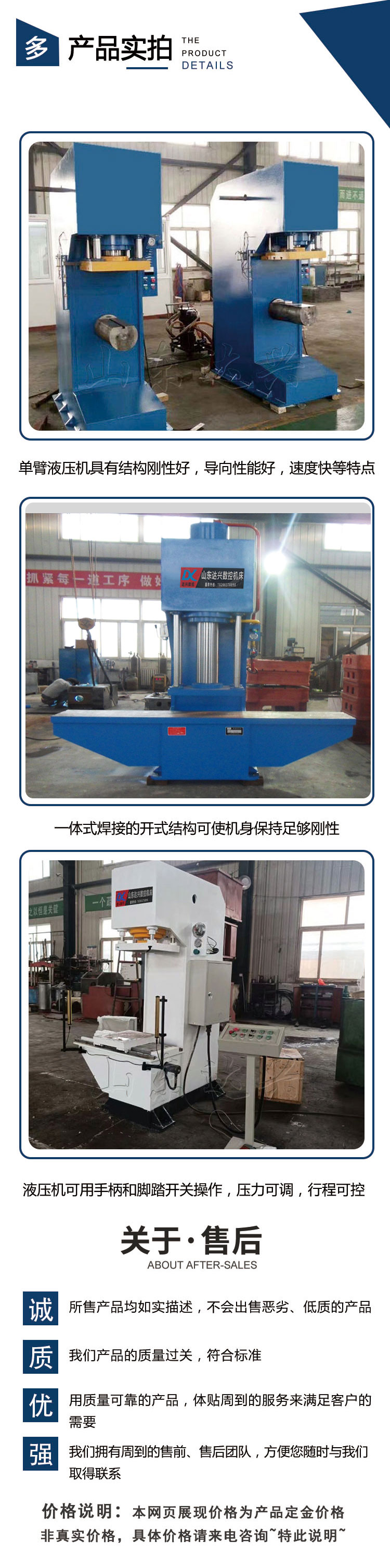 單柱(C型)系列液壓機主要適用于軸類和其他類似零件、型材的校正工藝。也可作為軸、套類零件的壓裝和板材原件的彎曲、拉伸、成型、落料、壓印等。主要應用于塑料制品、機床、內燃機、輕紡機械、軸類、軸承、洗衣機、汽車電機、空調電機、電器、軍工企業、三資企業裝配流水線等行業使用。非標定制10噸-1000噸不同工作臺面,不同開口、行程、喉深單臂式液壓機。實體廠家,質量售后有保障,支持現場面談、視頻驗廠。