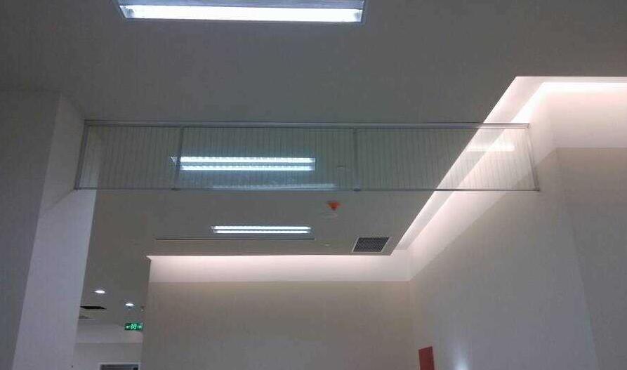 4 夾絲玻璃式:主要用在超市、大型商場以及無塵車間。下垂50公分。與透明玻璃不同的是,夾絲玻璃由兩層玻璃中間夾一層扁形鋼絲經特殊工藝壓合而成,在遇到爆炸的情況下,可有效預防玻璃碎片下落而造成的人員傷亡。大大提高產品安全性。